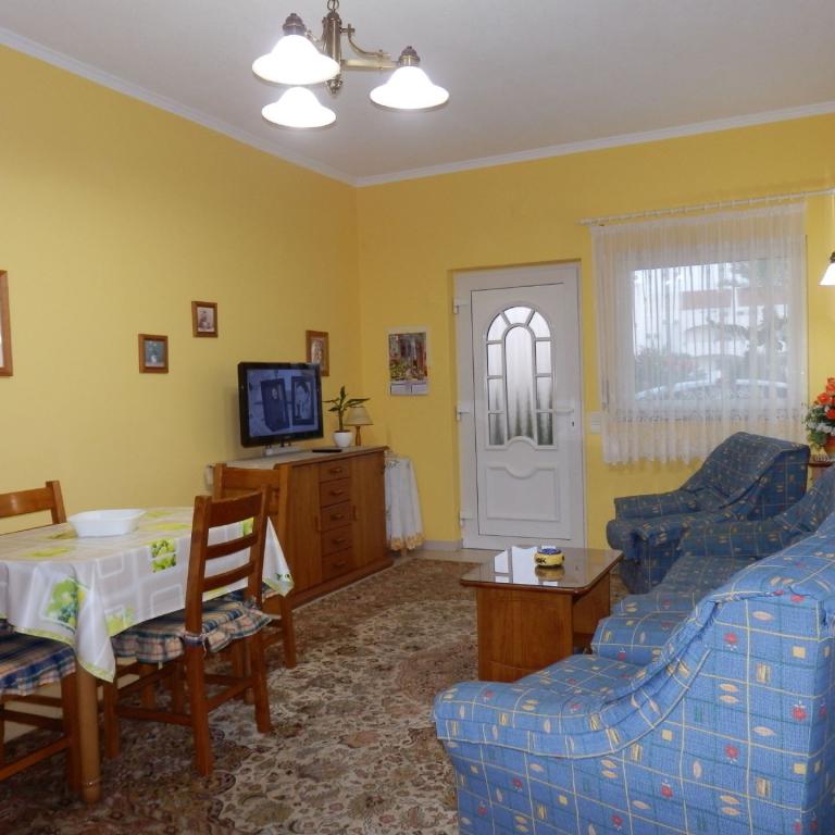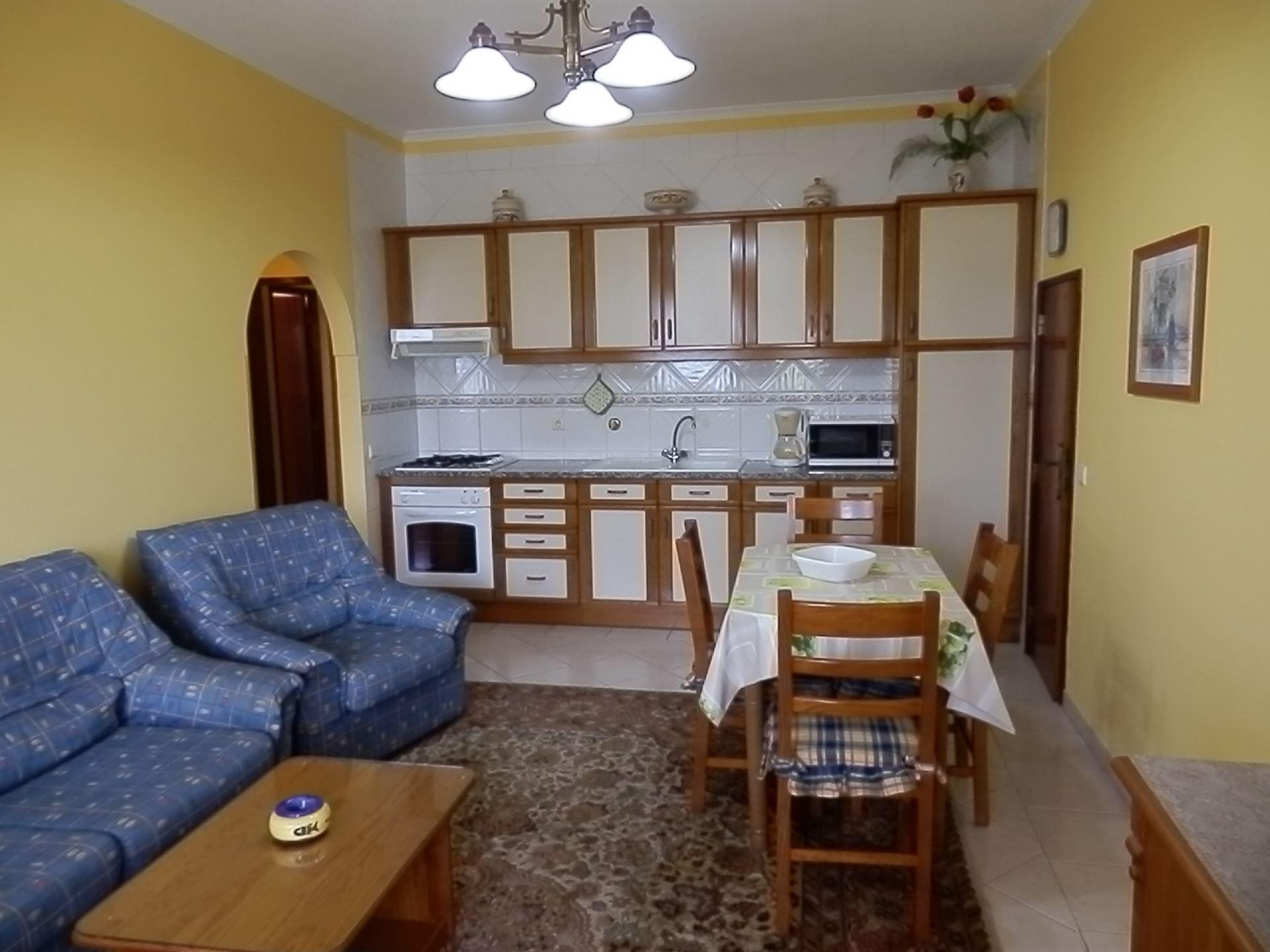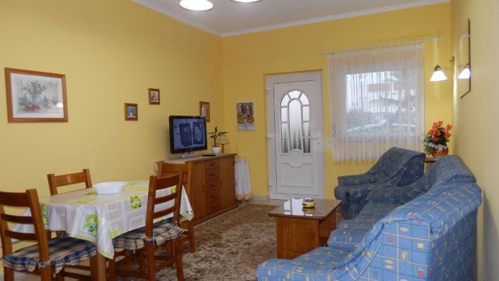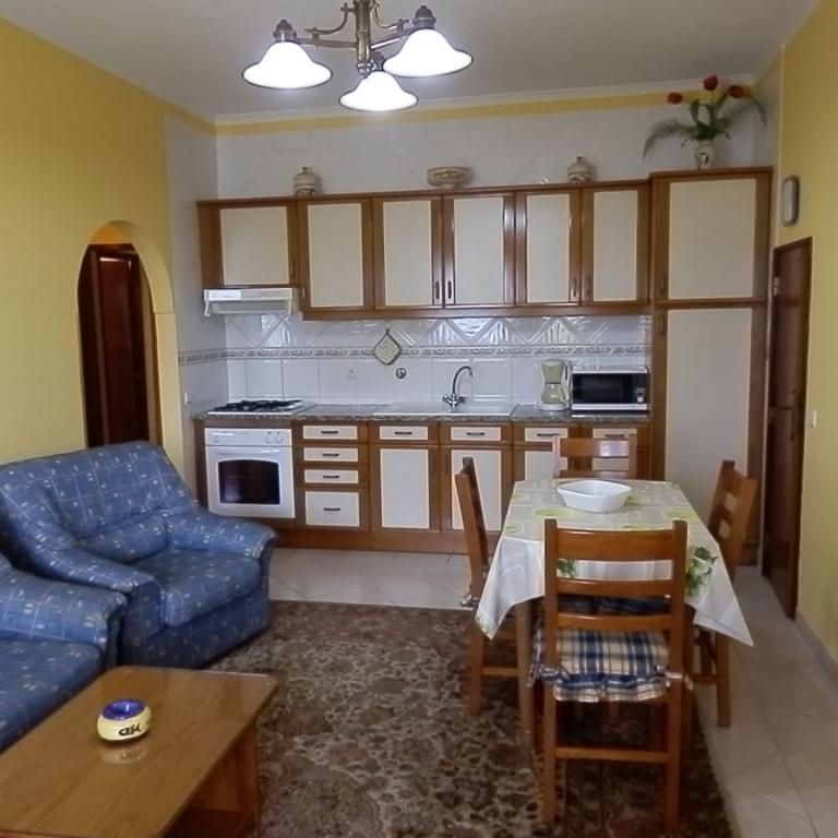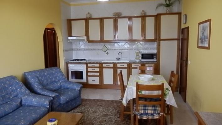 Das offene Wohnzimmer / Küche ist ausgestattet mit einem vierflammigen Gasherd, Elektrobackofen, Dunstabzugshaube, Toaster, Mikrowelle, Kaffeemaschine und einer Kühl- Gefrierkombination. Besteck und Geschirr ist vorhanden für 6 Personen. Am Esstisch finden bis zu 6 Personen Platz.