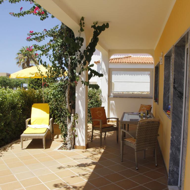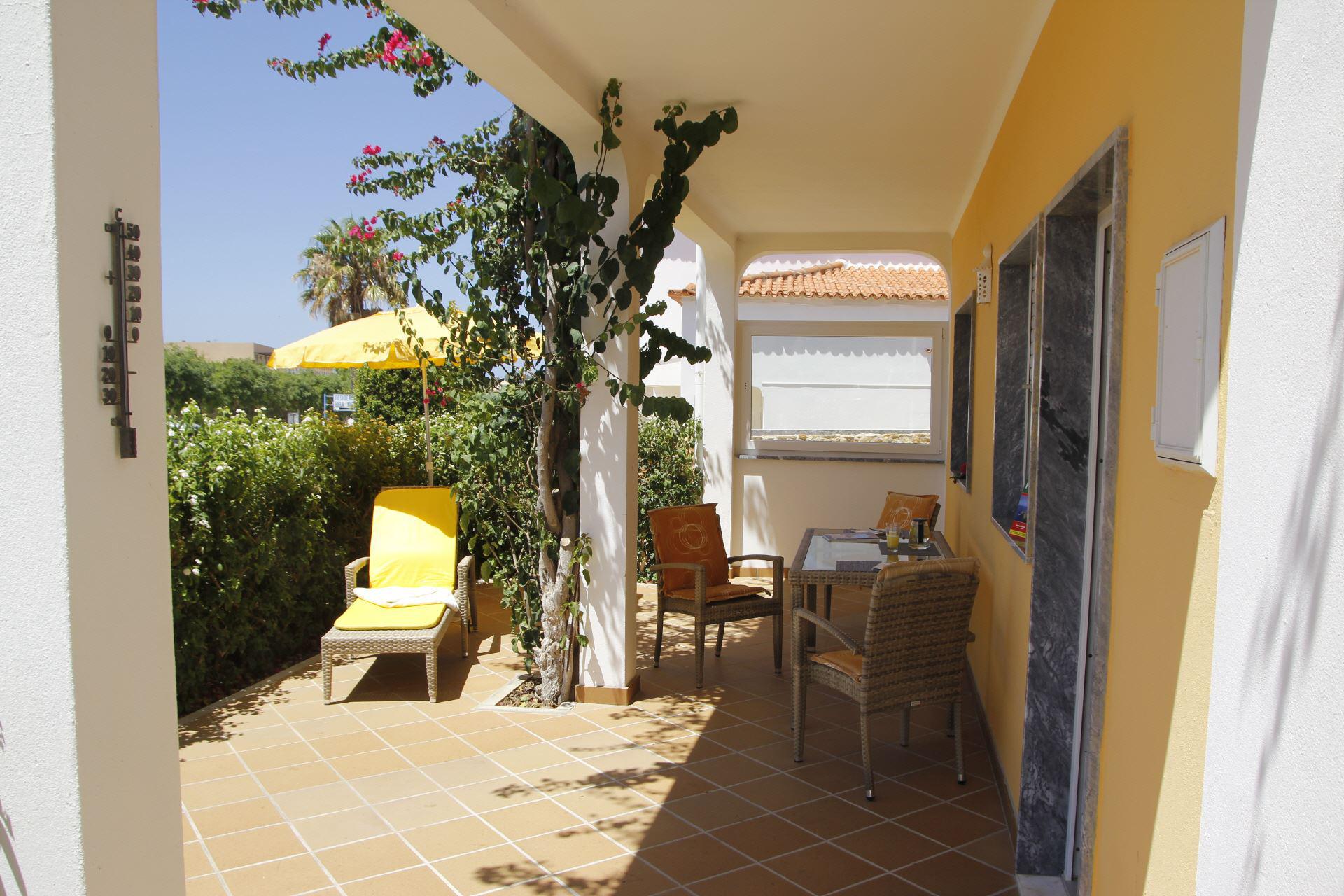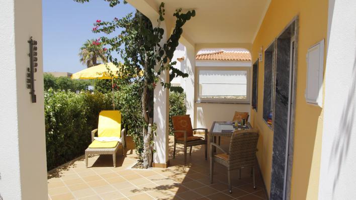 Die Terrasse des Apartments zeigt nach Süden. Liegestühle sind vorhanden.
